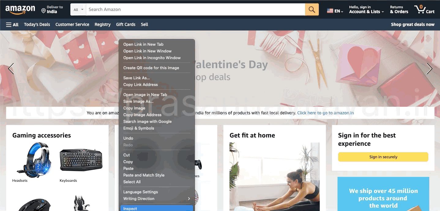 Go to any website say “amazon.com” (preferred browser: Chrome) and right click and click this option “Inspect element”. Next, go to console and type
